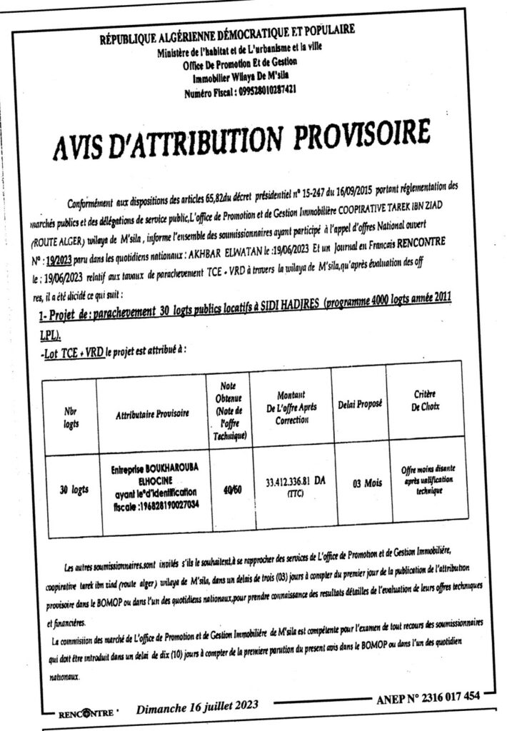 Avis d’attribution provisoire/ Office de Promotion et de Gestion Immobilier Wilaya de M’sila
