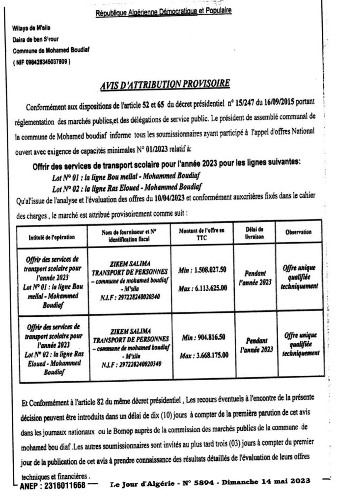 Avis d’attribution Provisoire: Offrir des services de transport scolaire pour l’année 2023/ Commune de Mohamed Boudiaf