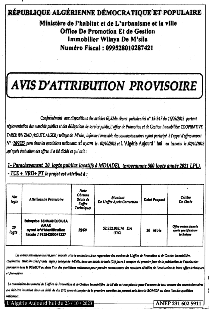 Avis d’attribution provisoire: Programme 500 logts Medjadel LPL/ Office de promotion et de gestion immobilier wilaya de M’sila