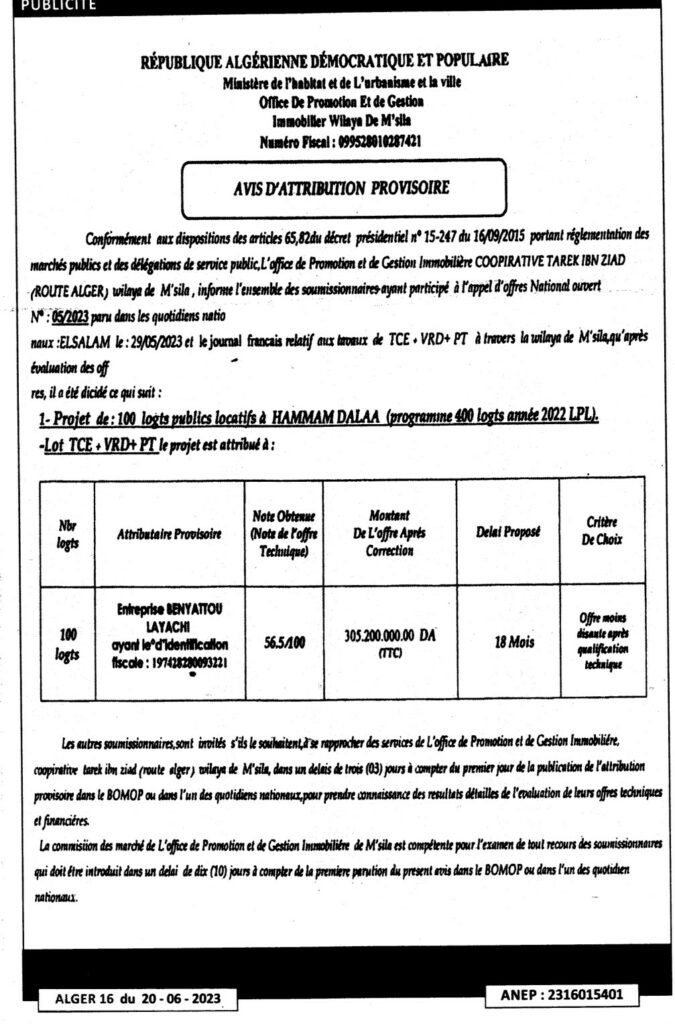 Avis d’attribution provisoire: projet 100 logts publics locatifs à hamama dalaa/ Office de promotion et de gestion immobilier wilaya de M’sila