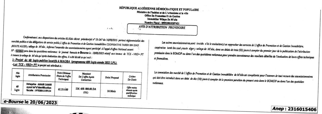 Avis d’attribution provisoire: Projet 40 logts publics locatifs à Magra/ Office de promotion et de gestion immobilier wilaya de M’sila