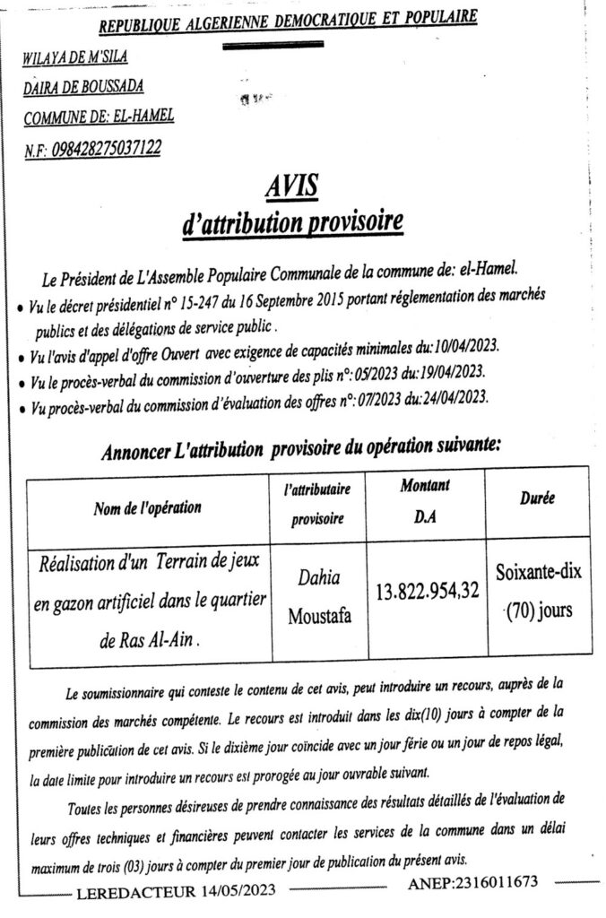 Avis d’attribution provisoire: Réalisation d’un terrain de jeux en gazon artificiel dans le quartier de Ras Al-ain/ Commune de Elhamel