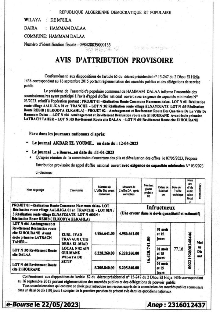 Avis d’attribution Provisoire: Réalisation Route Commune Hammam-Dalaa