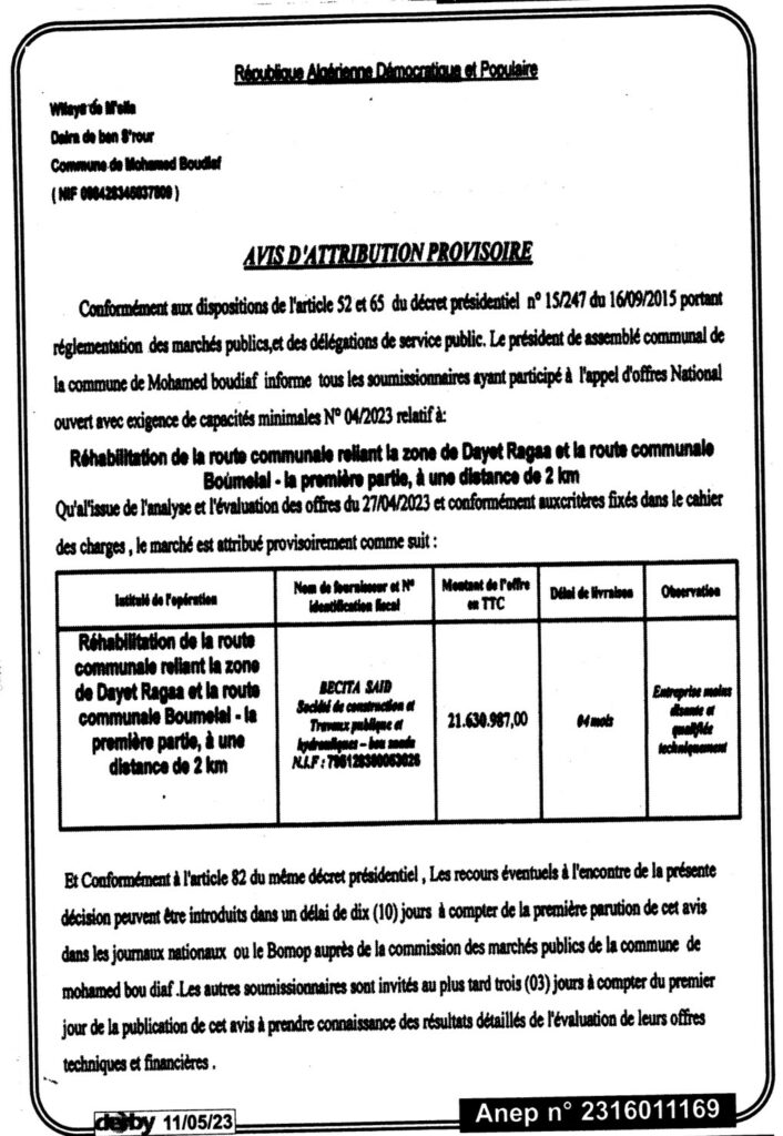 Avis d’Attribution Provisoire: réhabilitation de la route communale reliant la zone de Dayet Ragaa et la route communale Boumelal -La première partie a une distance de 2 km/ Commune de Mohamed Boudiaf