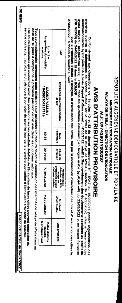 Avis d’attribution provisoire: Renouvèlement des équipements scolaires