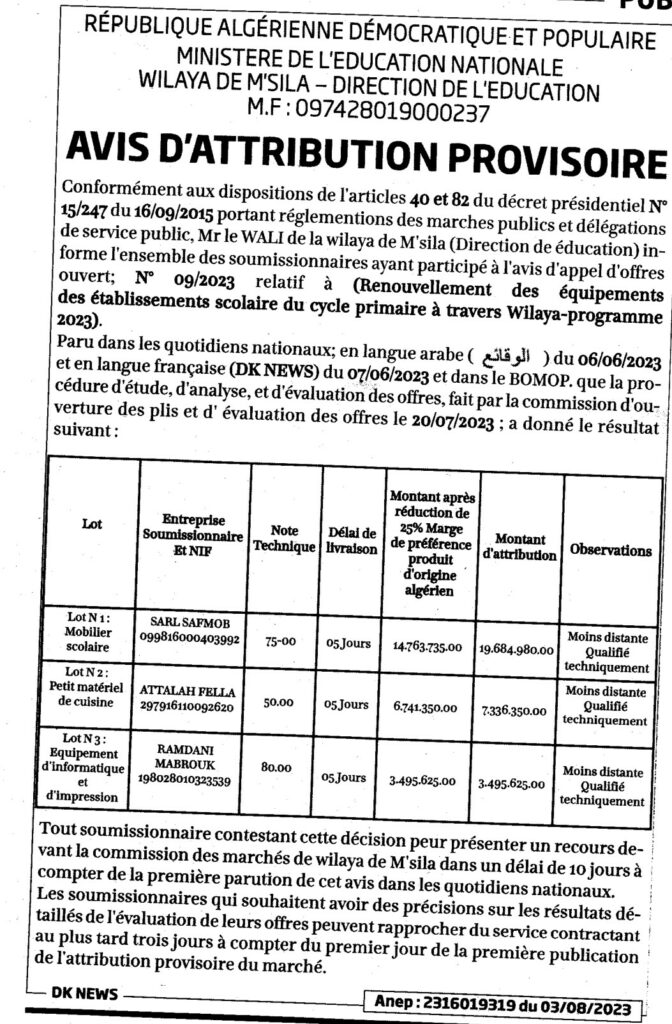 Avis d’attribution provisoire: Renouvellement des équipements des établissements scolaire du cycle primaire à travers wilyaa programme 2023/ direction de l’education de la wilaya de M’sila