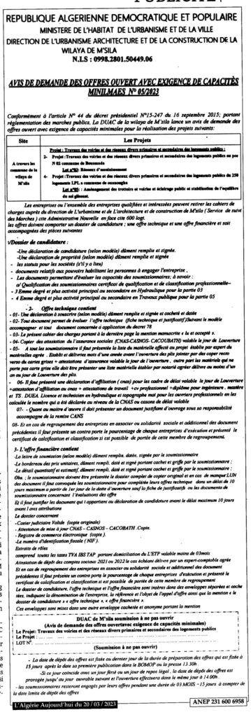 Avis de Demande des offres N°05/2023 Direction de l’Urbanisme Architecture et de la Construction de la Wilaya de M’sila