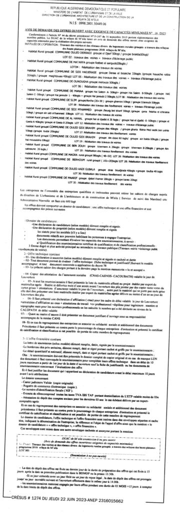 Avis de demande des offres ouverts N°16/2023 Direction de l’urbanisme de l’architecture et de la constructeur de la wilaya de M’sila
