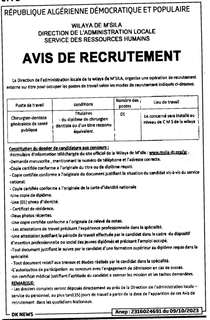 Avis de recrutement/ Direction de l’administration locale wilaya de M’sila