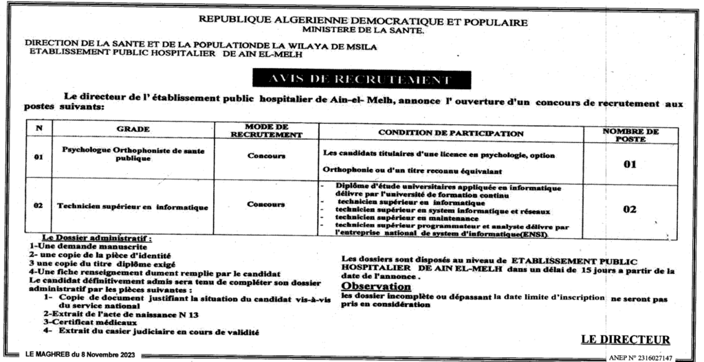 Avis de recrutement/ Établissement public hospitalier de Ain El-Melh