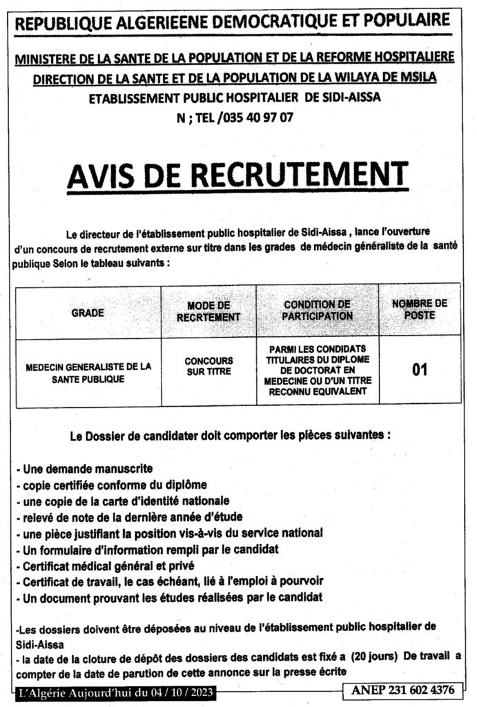 Avis de recrutement/ Établissement public hospitalier de sidi aissa