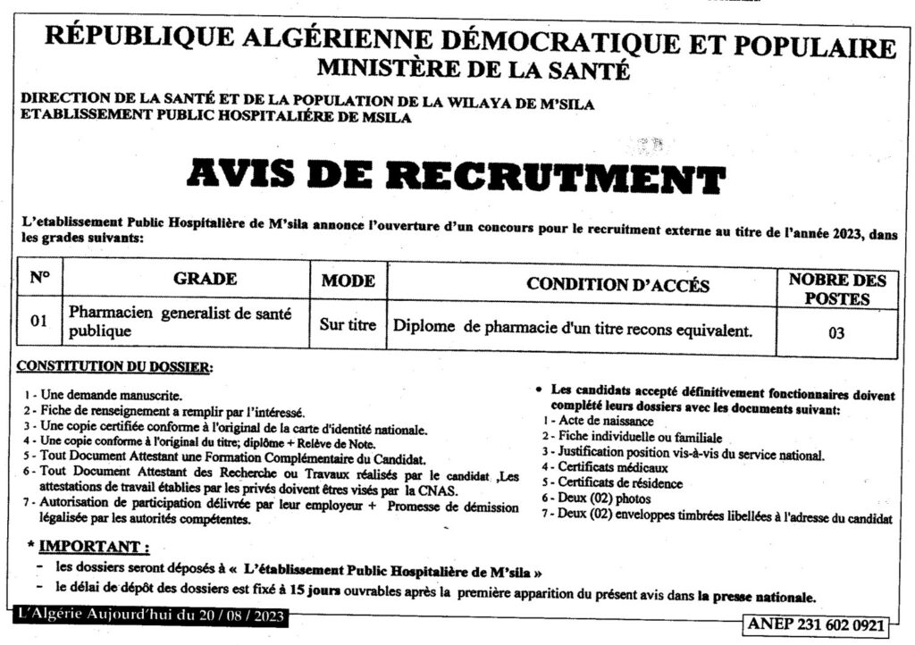 Avis de recrutement/ Établissement public hospitalière de M’sila