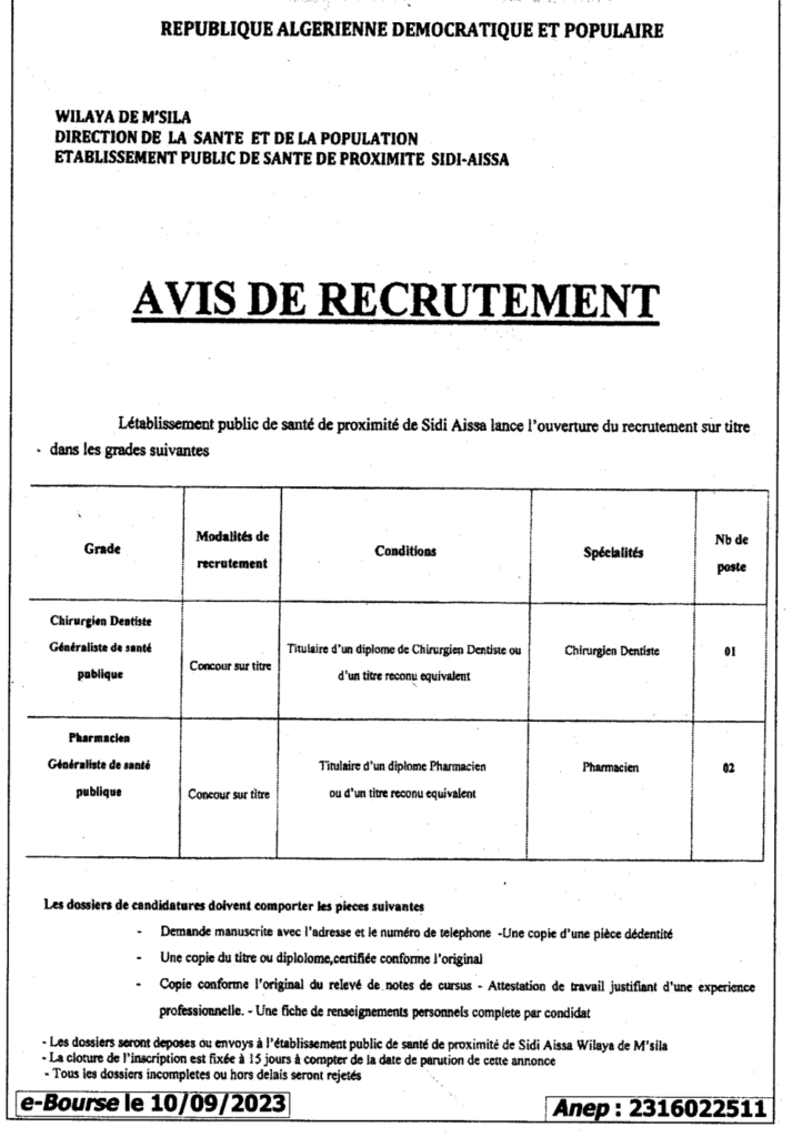 Avis de recrutement/ Établissement publics de santé de proximité Sidi-Aissa