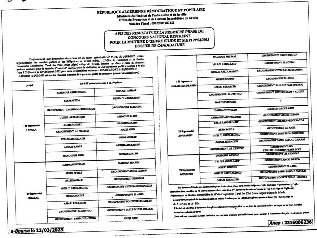 Avis des Résultats de la Première Phase du Concours National Restreint pour la Maitrise d’œuvre étude et suivi N°03/2023
