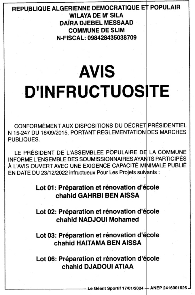 Avis D’infructuosité/ Commune de Slim