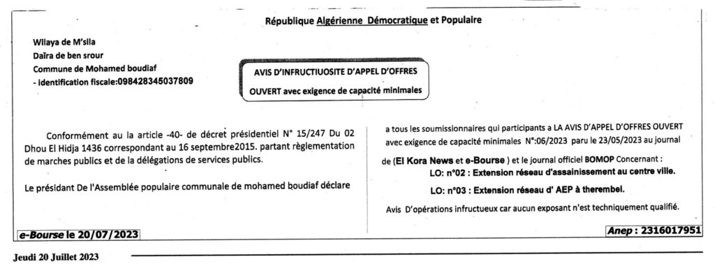 Avis d’infructuosité d’appel d’offres ouvert/ Commune de Mohamed Boudiaf