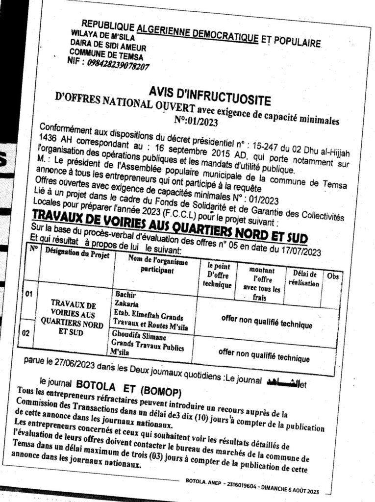Avis d’infructuosité d’offres national ouvert N°01/2023 Commune de temsa