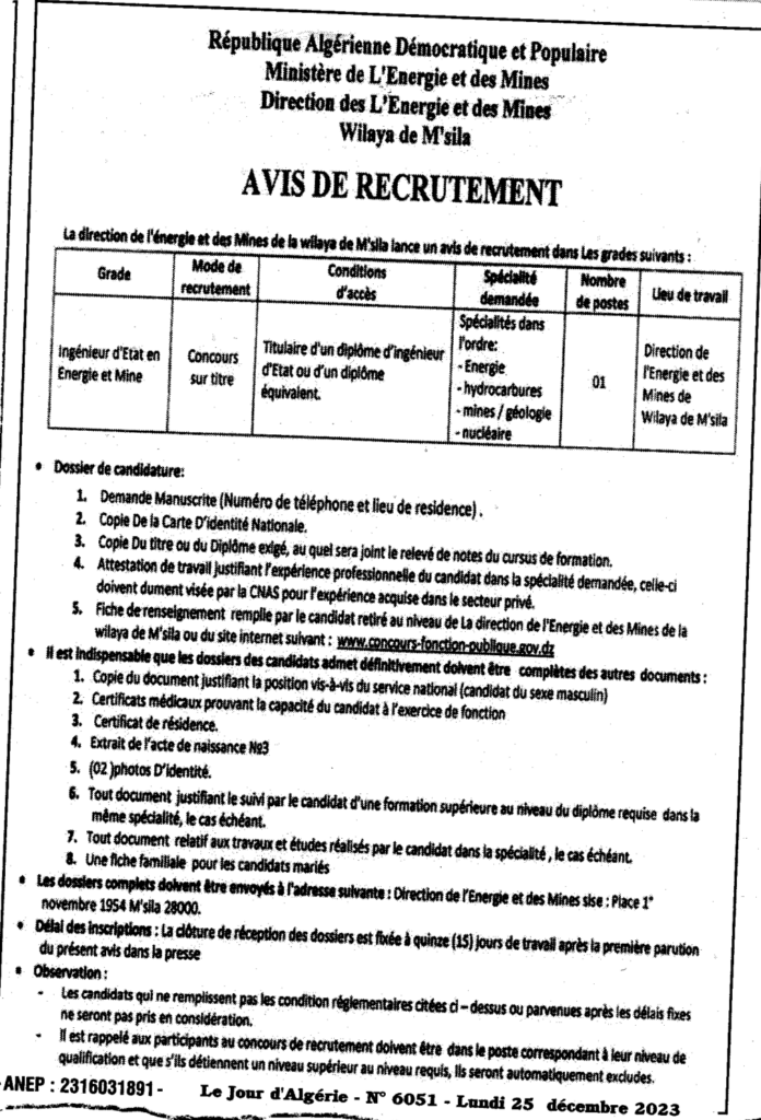 Avis Recrutement: Ingénieur d’État en énergie et mine/ Direction des l’énergie et des mines Wilaya de M’sila