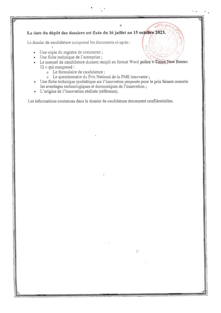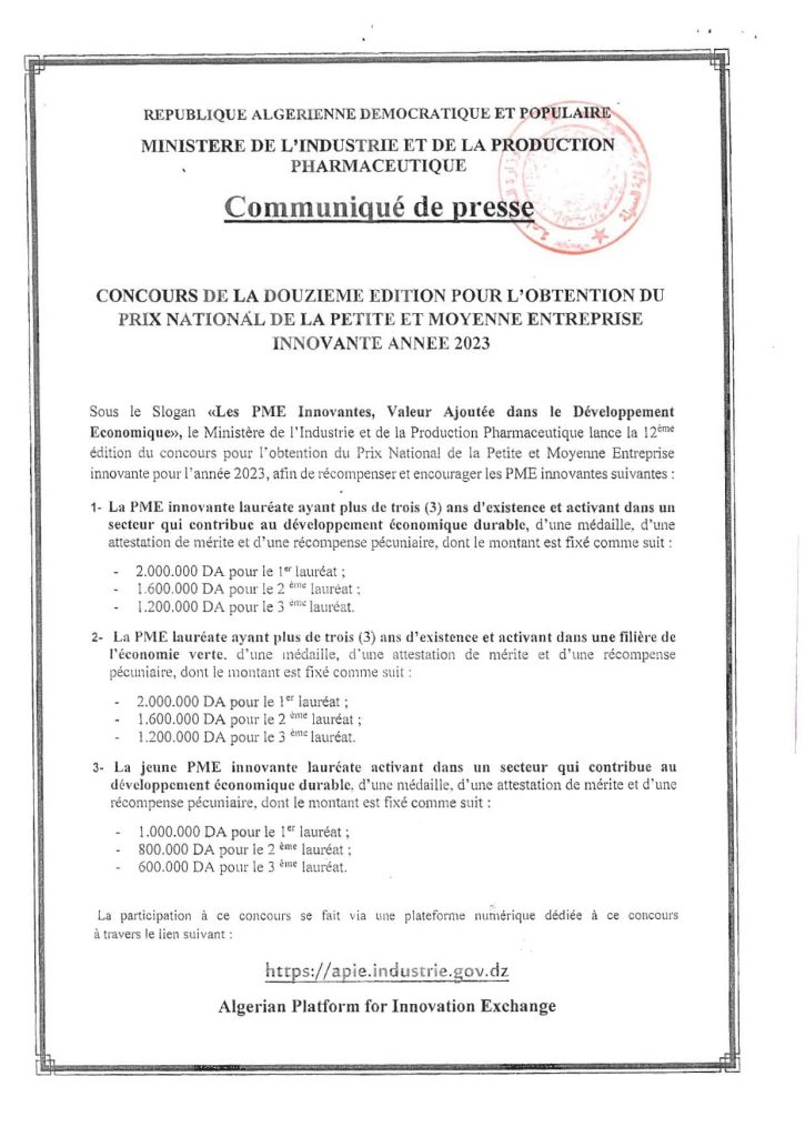 Communiqué de Presse/ Concours de la douzième édition pour l’obtention du prix national de la petite et moyenne entreprise innovante année 2023