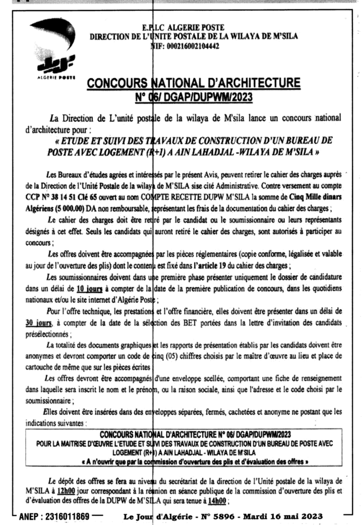 Concours National d’Architecture N°06/DGAP/DUPWM/2023 Direction de l’Unite Postale de M’sila