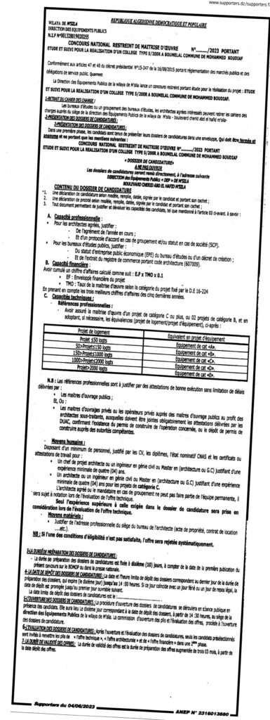 Concours National Restreint de d’œuvre portant étude et suivi pour la réalisation d’un collège type 5/200 a Boumalal commune de Mohamed Boudiaf/ Direction des Équipements Publics