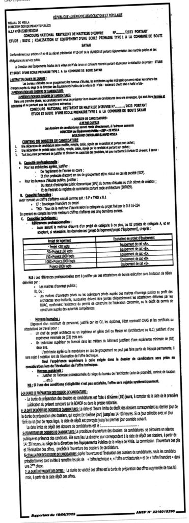 Concours national restreint de maitrise d’œuvre portant étude, suivi d’un école primaire type 1 à la Commune de Bouti sayeh