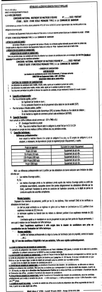 Concours national restreint de maitrise d’œuvre portant étude, suivi d’un école primaire type 2 Commune de Barhoum