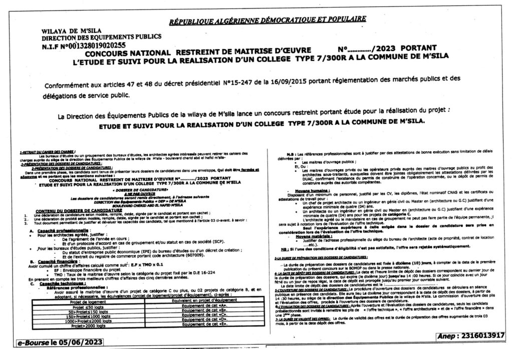 Concours national restreint de maitrise d’œuvre portant l’étude et suivi pour la réalisation d’un collège type 7/300 repais a la commune de M’sila