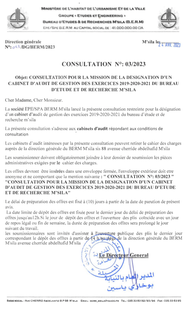 Consultation pour la mission de la designation d’un cabinet d’audit de gestion des exercices 2019-2020-2021 du bureau d’etude et de recherche M’sila