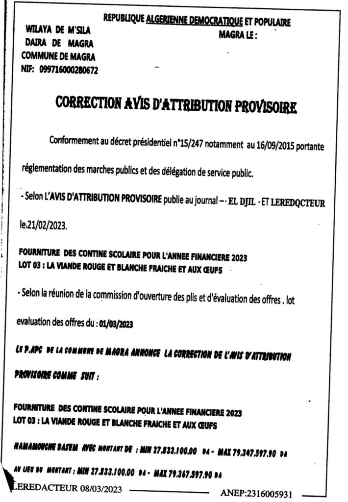 Correction Avis d’Attribution Provisoire/ Commune de Magra