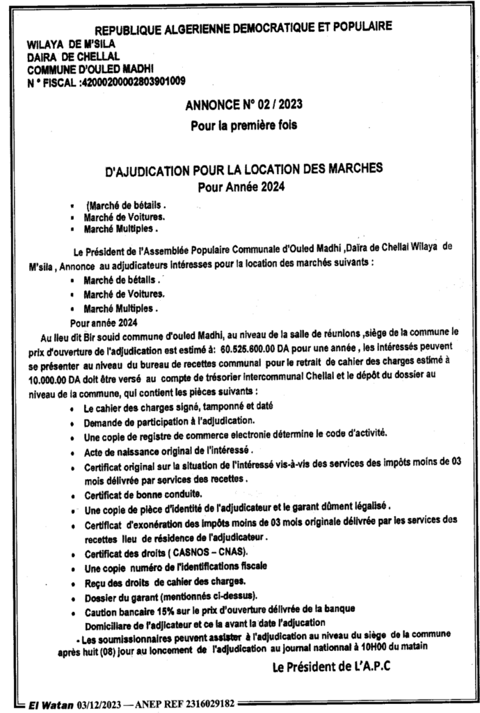 D’ajudication pour la location des marches pour Année 2024/ Commune d’ouled Madhi