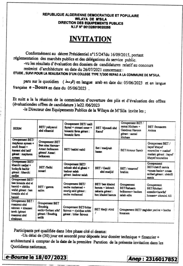Invitation/ Direction des équipements publics wilaya de M’sila