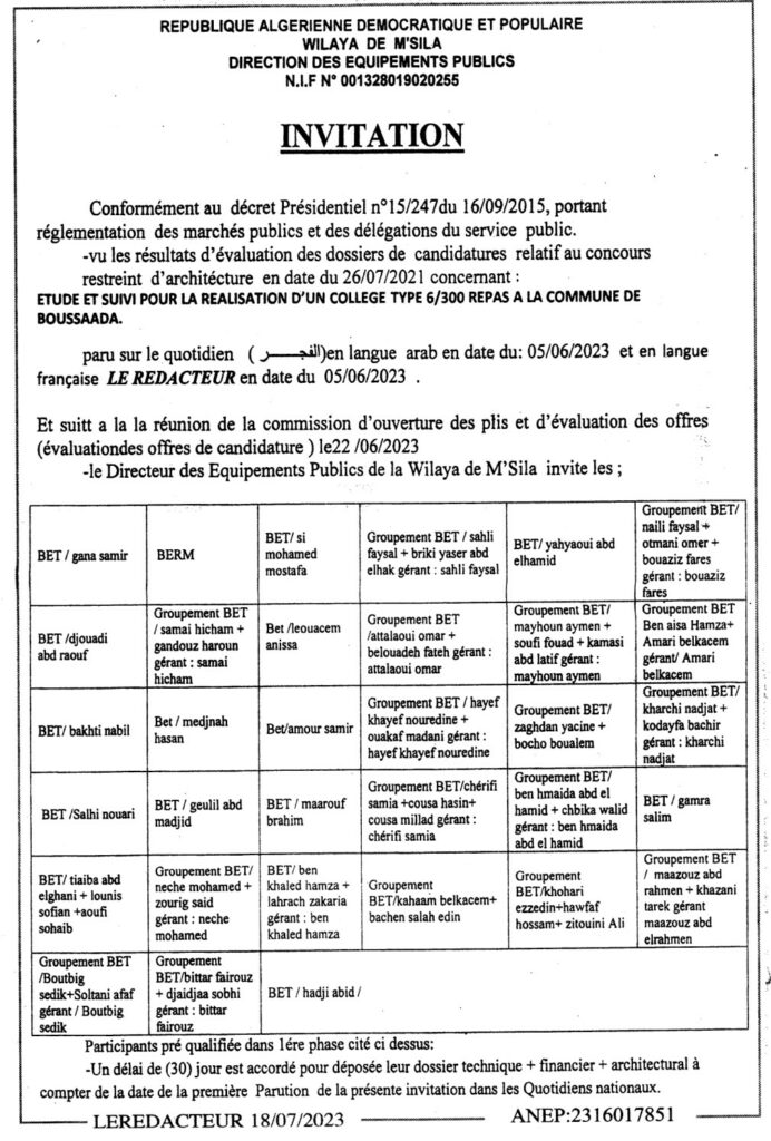 Invitation/ Direction des équipements publics wilaya de M’sila