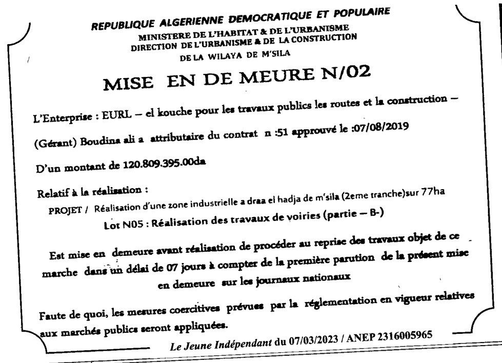 Mise En De Meure N°02/ Direction de L’urbanisme de La Construction
