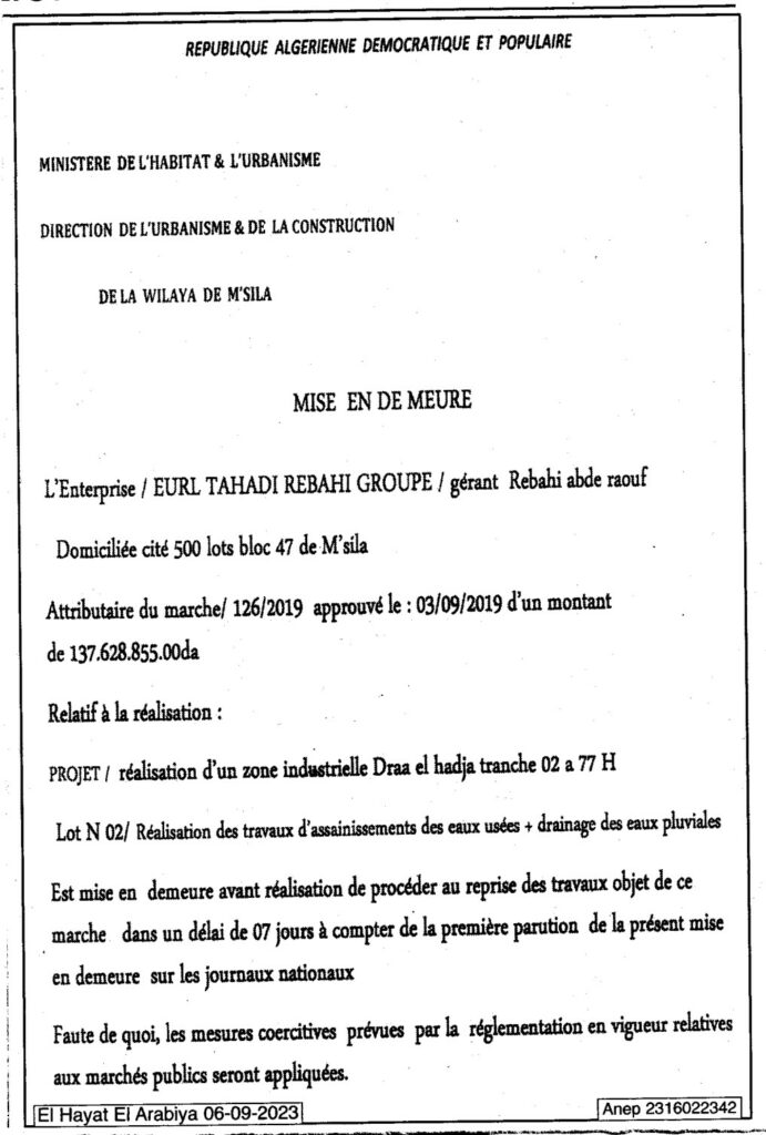 Mise en demeure/ Direction de l’urbanisme et de la construction de la wilaya de M’sila