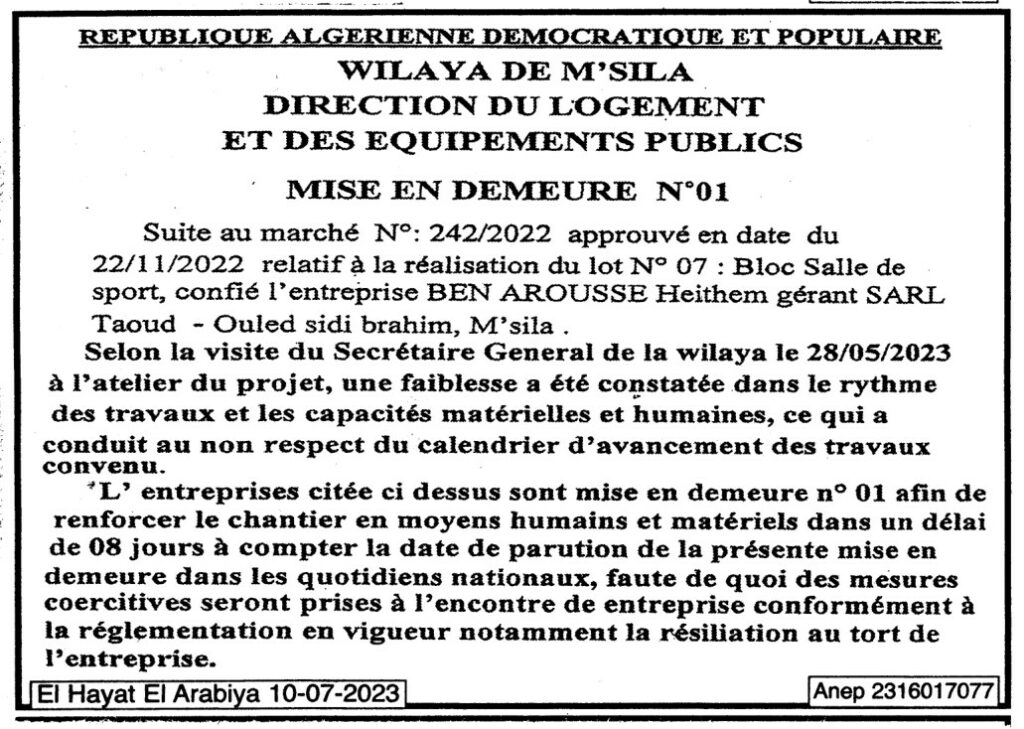 Mise en demeure N°01/ Direction du logement et des équipements publics wilaya de M’sila