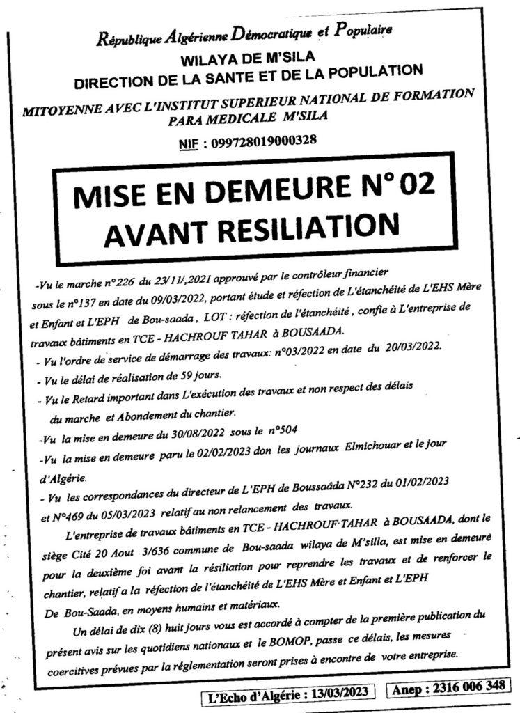 Mise en Demeure N°02 Avant Résiliation/ Direction de la Santé et de la Population