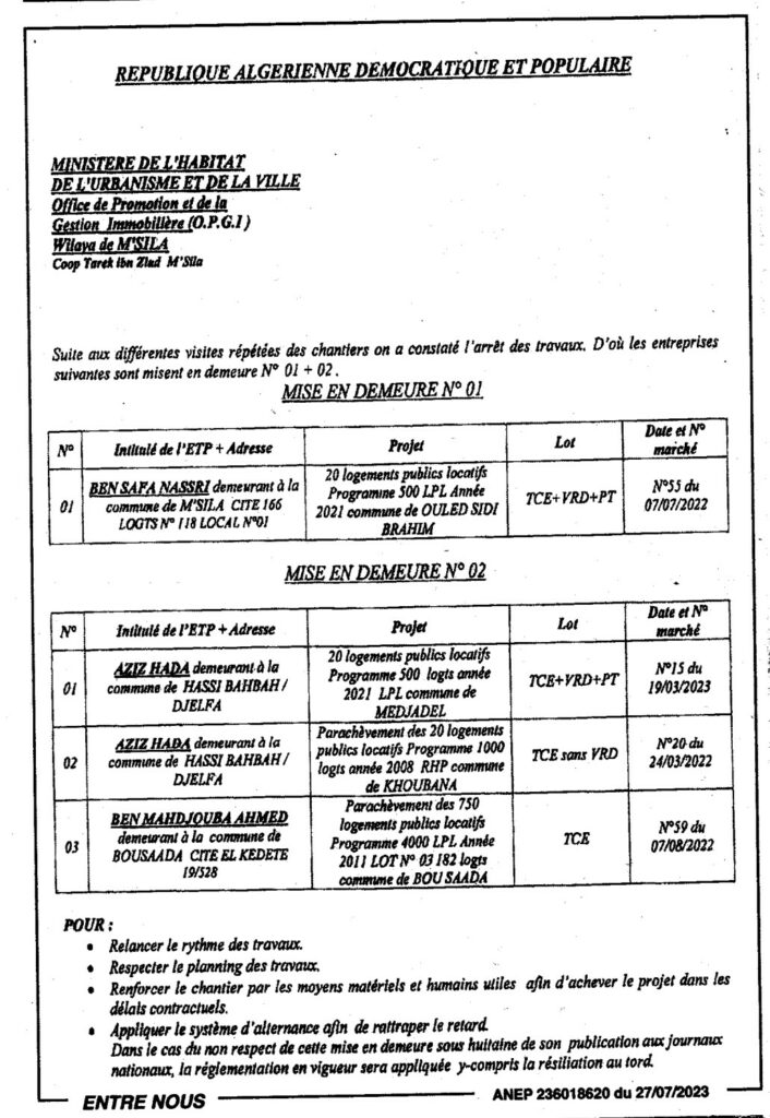 Mise en demeure/ Office de promotion et de la gestion immobilière wilaya de M’sila