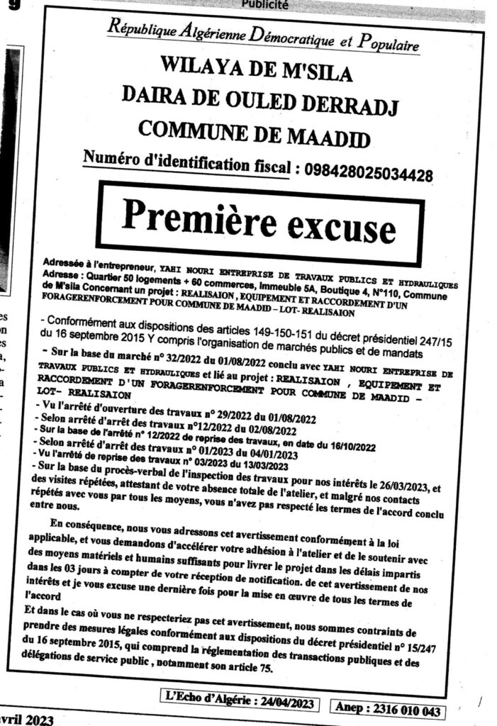 Première excuse/ Commune de Maadid
